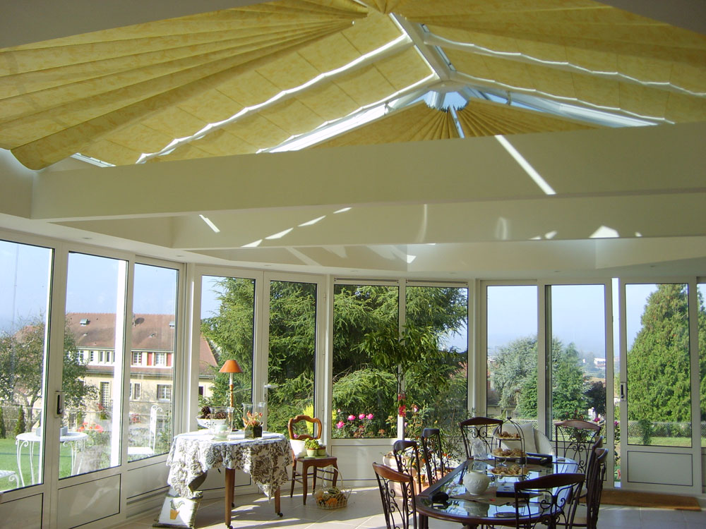 De forme rectangulaire, trapézoïdale ou triangulaire, le store « OASIS » assure la protection solaire des vérandas en bois et en aluminium avec chevrons. Il coulisse entre les travées, portés par des raidisseurs en aluminium régulièrement espaces sur des câbles tendus.